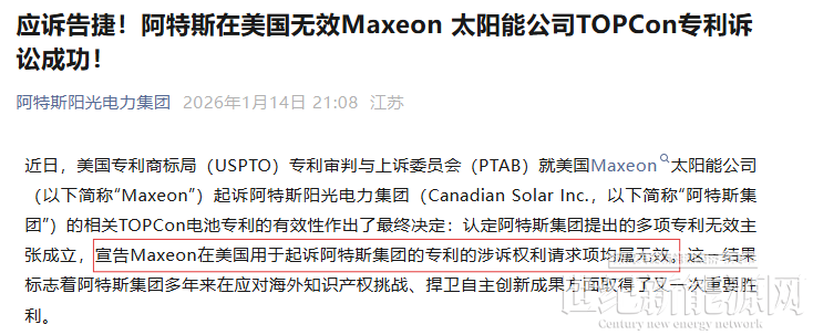 对此,阿特斯直接发文“应诉告捷!”,明确这一结果是其多年来在海外知识产权领域主动挑战、捍卫自主创新成果的又一重要胜利。