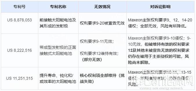 1月15日,美国专利审判与上诉委员会(PTAB)作出裁决:TCL中环子公司Maxeon Solar主张的两项核心TOPCon专利US8,222,516(前接触电池结构)、US8,878,053(发射极形成)被判定无效,仅一项涉及制造工艺的专利US11,251,315(钝化与效率优化)保留部分权利要求。