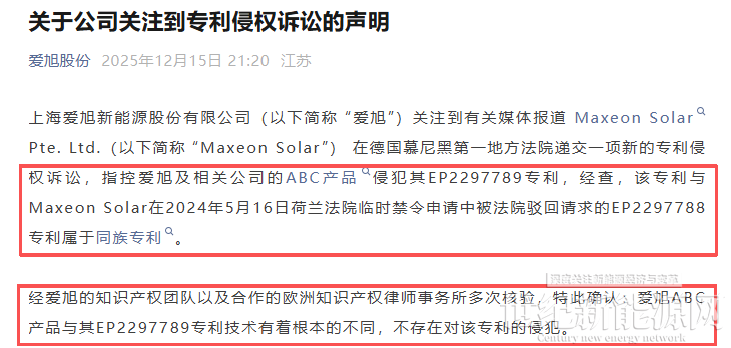 过去两年间,Maxeon针对爱旭先后发起4次专利起诉,起诉地点分别选在荷兰(1次)、德国(2次)及统一专利法院(UPC,中央法庭本部位于慕尼黑,1次),2024年5月,荷兰海牙地方法院对爱旭作出了不批准临时禁令申请的判决,算是爱旭小胜一局,Maxeon随即提起上诉,但后续据媒体报道其因未缴纳保证金而导致的上诉被驳回。