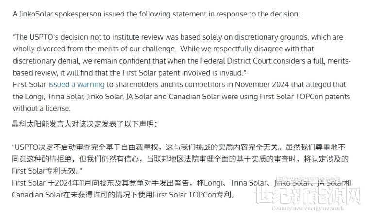 但显然,结果不尽如人意。晶科发言人在声明中提到,USPTO决定完全基于自由裁量权,这与我们挑战的实质内容完全无关。
