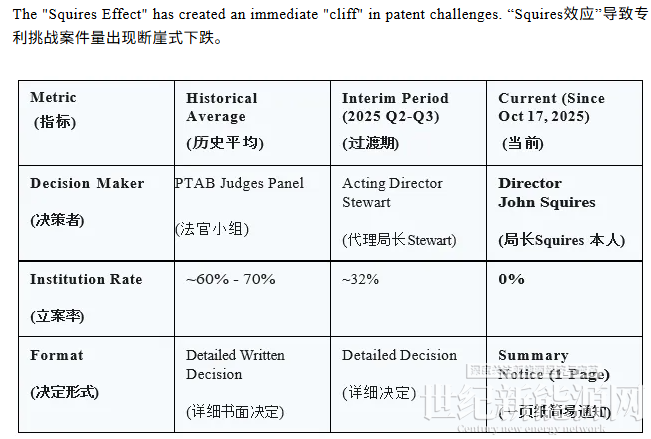 这期间新任局长约翰·斯奎尔斯(John Squires)宣布直接掌控IPR/PGR的立案决定权,专利挑战案件量断崖下跌。