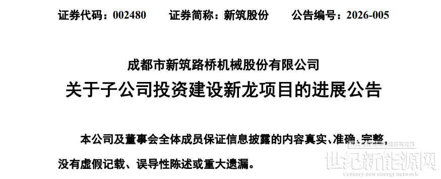 1月31日,成都市新筑路桥机械股份有限公司发布公告称,其控股子公司四川晟天新能源发展有限公司投资建设的新龙县色戈20万千瓦供电保障光伏储能项目因土地问题无法按期推进,已收到当地政府终止项目的通知。