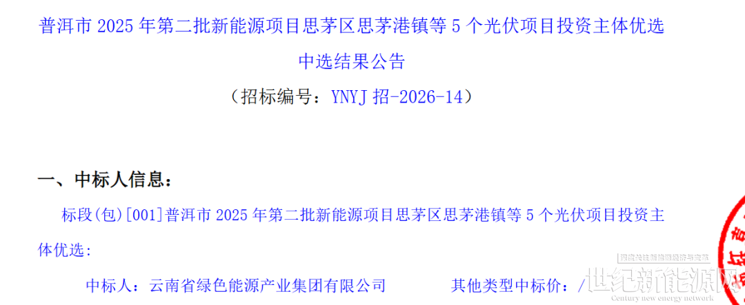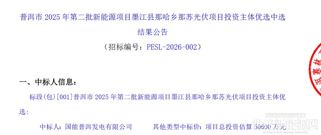 近日,普洱市发展和改革委员会相继公布了普洱市2025年第二批新能源项目投资主体优选中选结果公告,共有7个光伏项目,规模合计460MW。