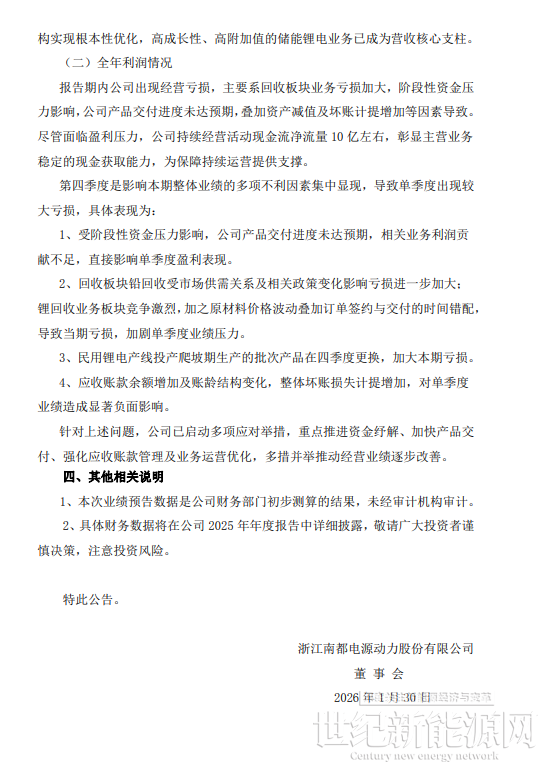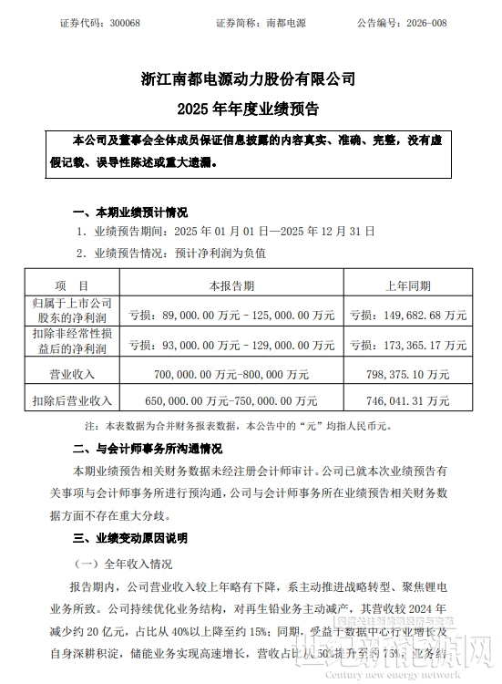 1月30日,南都电源发布2025年年度业绩预告。预计2025年归母净利润亏损8.9亿元~12.5亿元,上年同期亏损14.97亿元,亏损幅度收窄16.50%~40.55%;预计2025年扣非净利润亏损9.3亿元~12.9亿元,上年同期亏损17.34亿元。
