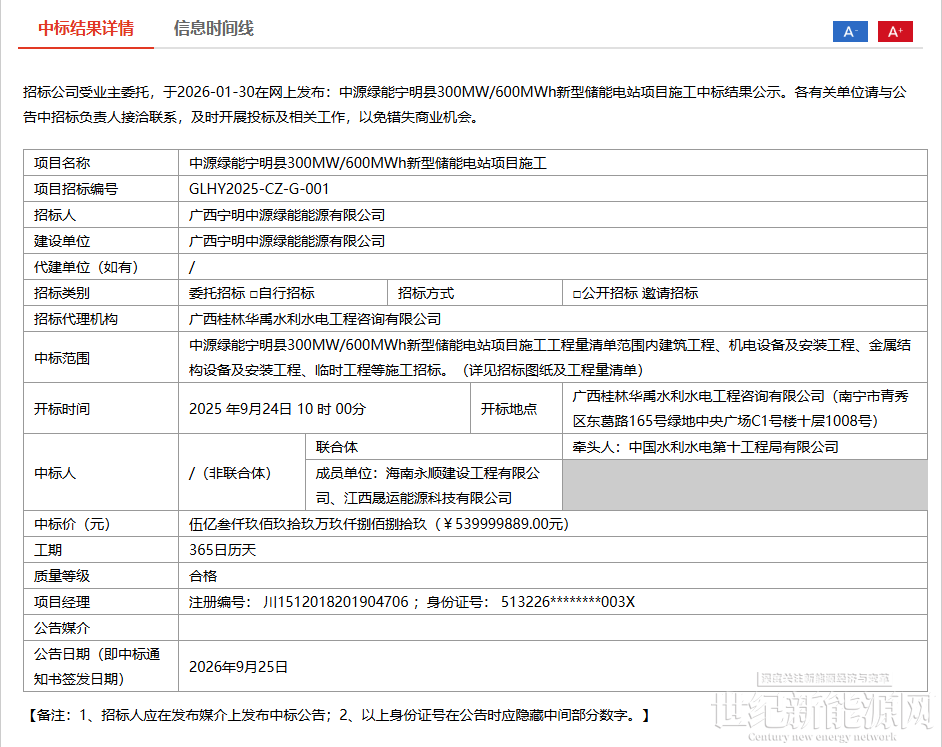 此次中标范围包括中源绿能宁明县300MW/600MWh新型储能电站项目施工工程量清单范围内建筑工程、机电设备及安装工程、金属结构设备及安装工程、临时工程等施工招标。
