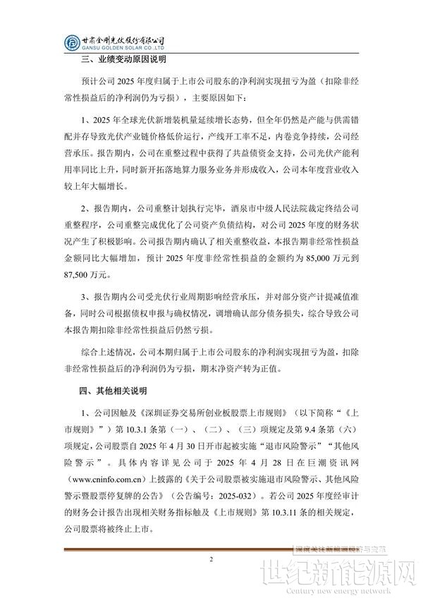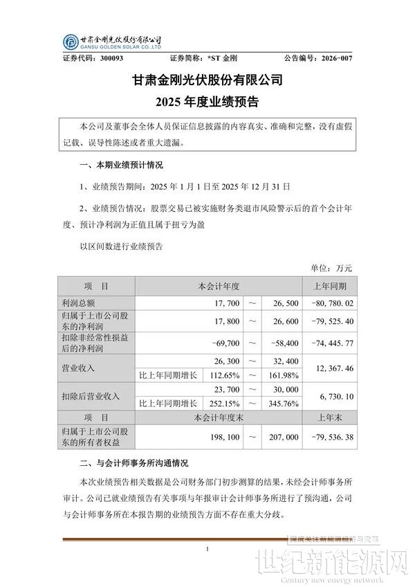 1月30日,A股上市公司*ST金发布全年业绩预告,公司预计2025年1-12月扭亏为盈,营业收入为2.63亿至3.24亿元,归属于上市公司股东的净利润为1.78亿至2.66亿,净利润同比增长122.38%至133.45%。