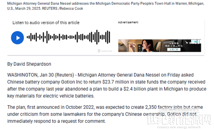 近日,根据路透社报道称:密歇根州总检察长达娜・内塞尔(Dana Nessel)于周五要求中国电池企业国轩高科(Gotion Inc)归还其已收到的2370万美元(约折合1.65亿人民币)州政府资金。该公司去年放弃了在密歇根州建造一座价值24亿美元(约折合166.84亿人民币)工厂的计划,这座工厂原本用于生产电动汽车电池的关键材料。