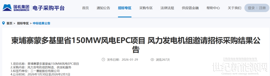 近日,国机集团发布《柬埔寨蒙多基里省150MW风电EPC项目风力发电机组邀请招标采购结果公告》。