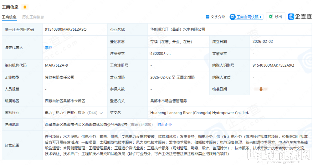 2月2日,宁德时代、华能水电合资成立华能澜沧江(昌都)水电有限公司,该公司法定代表人为李然,注册资本达48亿元人民币。