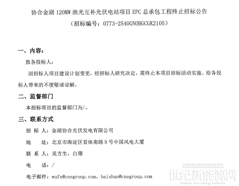 协合金湖120MW渔光互补光伏电站项目EPC总承包公告显示,因招标人项目建设计划变更,经招标人研究决定,需终止本项目招标活动实施。