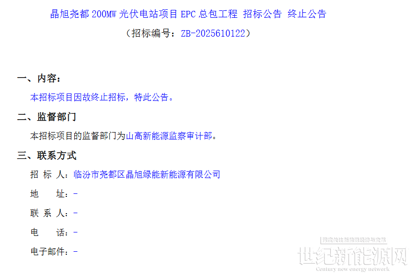 晶旭尧都200MW光伏电站项目EPC总承包公告显示,具体终止原因未具体披露。