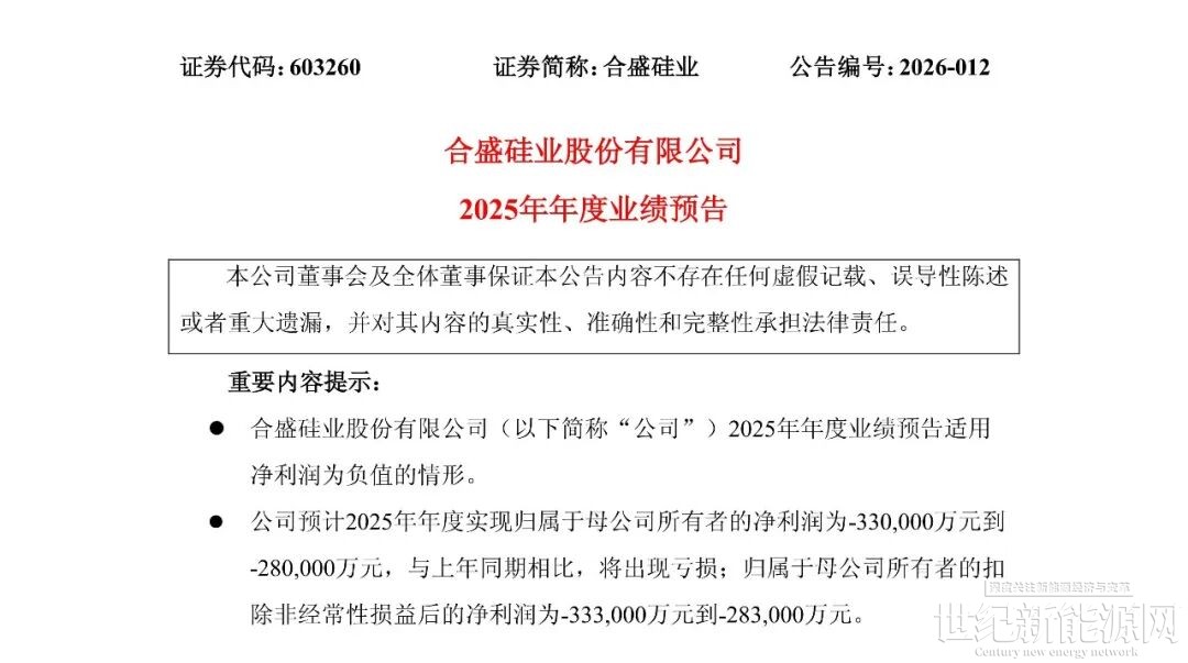 2025年度光伏企业“成绩单”相继发布预告,作为各个环节的龙头,自是备受关注。1月30日,工业硅、有机硅双龙头合盛硅业(603260)发布了2025年业绩预告,可以说是其上市以来年度“最差”成绩单也不为过。