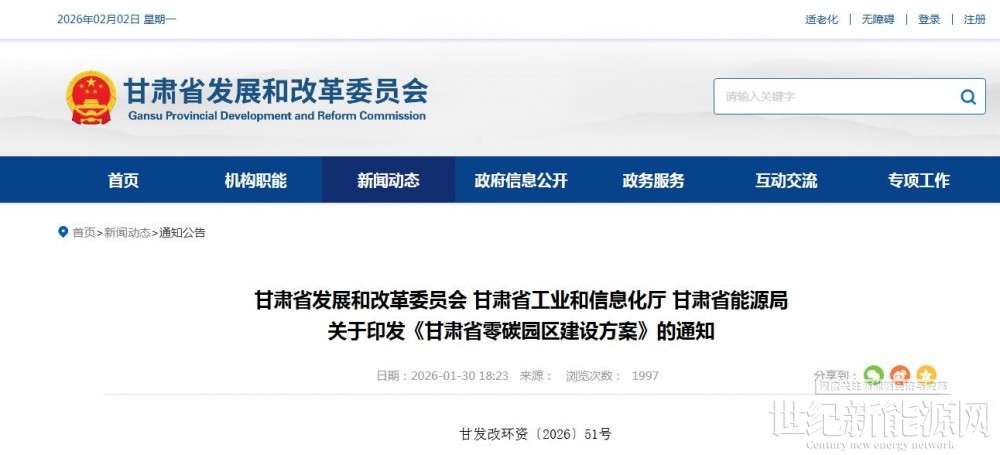1月30日,甘肃省发展和改革委员会、甘肃省工业和信息化厅、甘肃省能源局发布关于印发《甘肃省零碳园区建设方案》的通知。