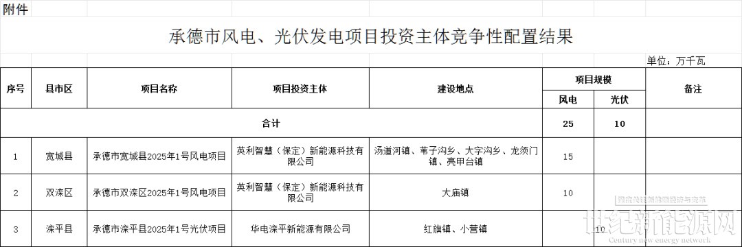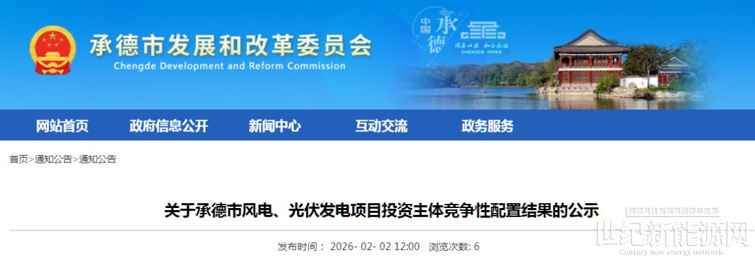 2月2日,承德市发展和改革委员会发布《关于承德市风电、光伏发电项目投资主体竞争性配置结果的公示》。