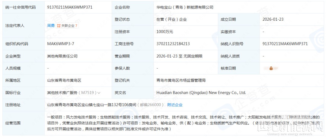 企查查显示,近日,华电宝山(青岛)新能源有限公司成立,法定代表人为周勇,注册资本1000万元,经营范围:一般项目:风力发电技术服务;生物质能技术服务;技术服务、技术开发、技术咨询、技术交流、技术转让、技术推广;太阳能发电技术服务。(除依法须经批准的项目外,凭营业执照依法自主开展经营活动)许可项目:发电业务、输电业务、供(配)电业务;生物质燃气生产和供应。(依法须经批准的项目,经相关部门批准后方可开展经营活动,具体经营项目以相关部门批准文件或许可证件为准)