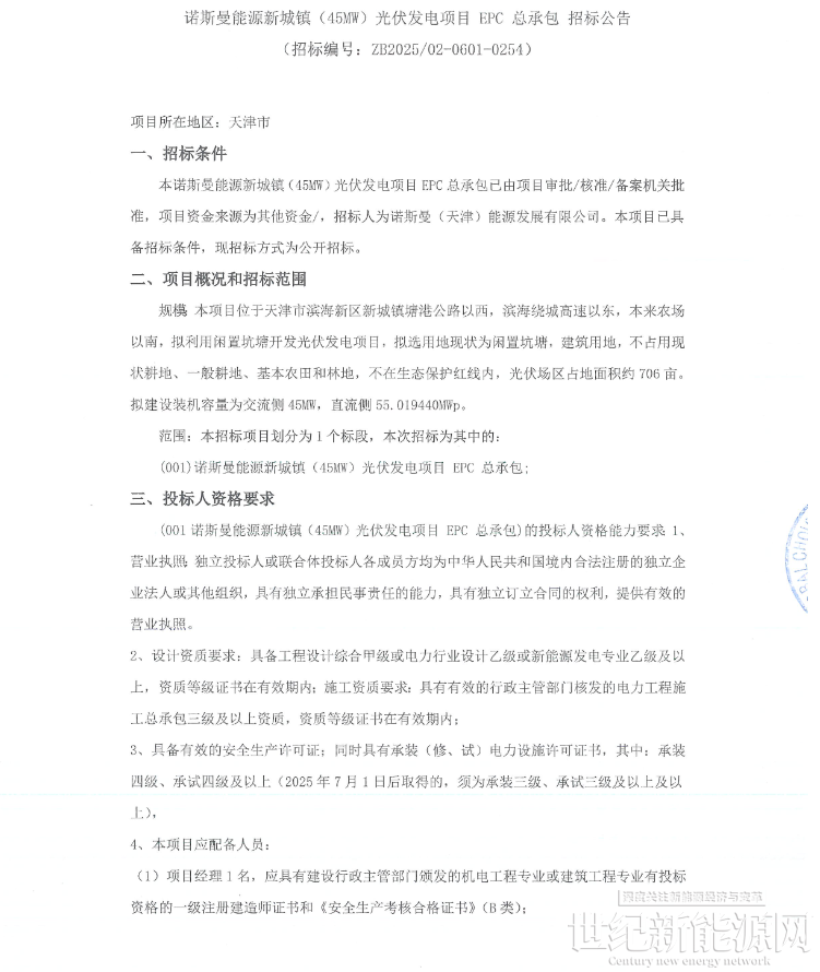 据悉,项目招标人为诺斯曼(天津)能源发展有限公司,项目所在地位于天津市。