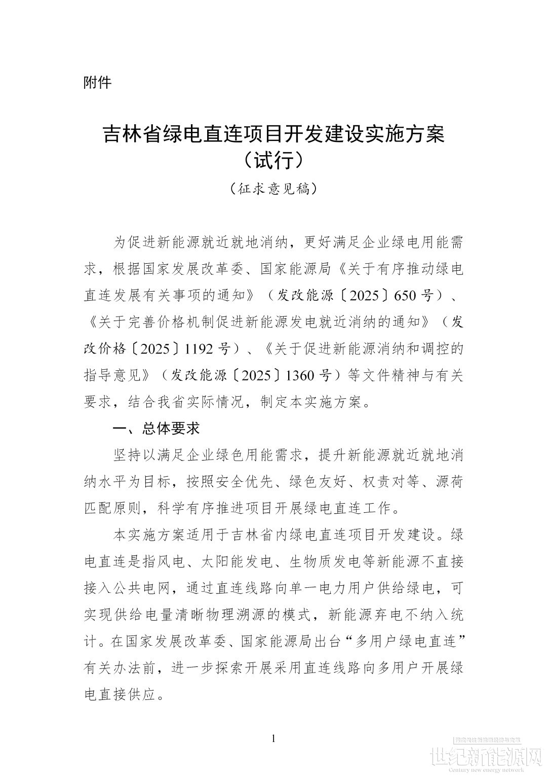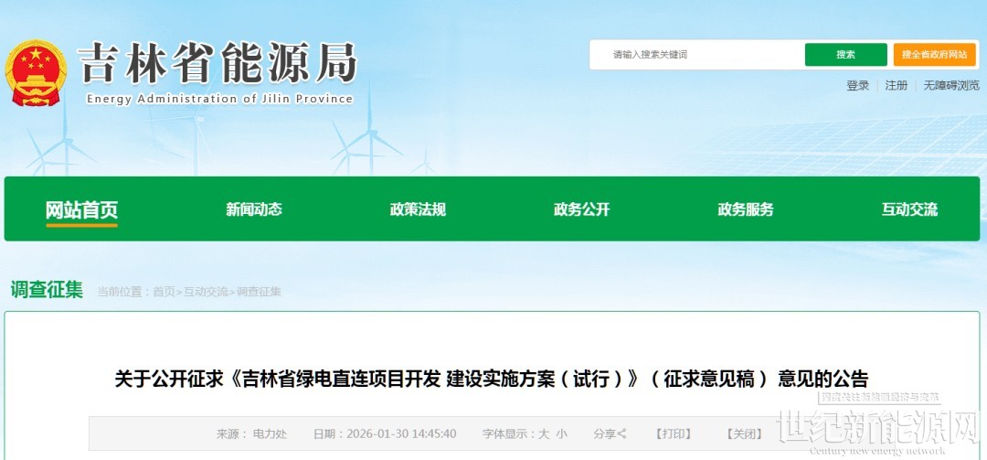 1月30日,吉林省能源局发布关于公开征求《吉林省绿电直连项目开发 建设实施方案(试行)》(征求意见稿) 意见的公告。