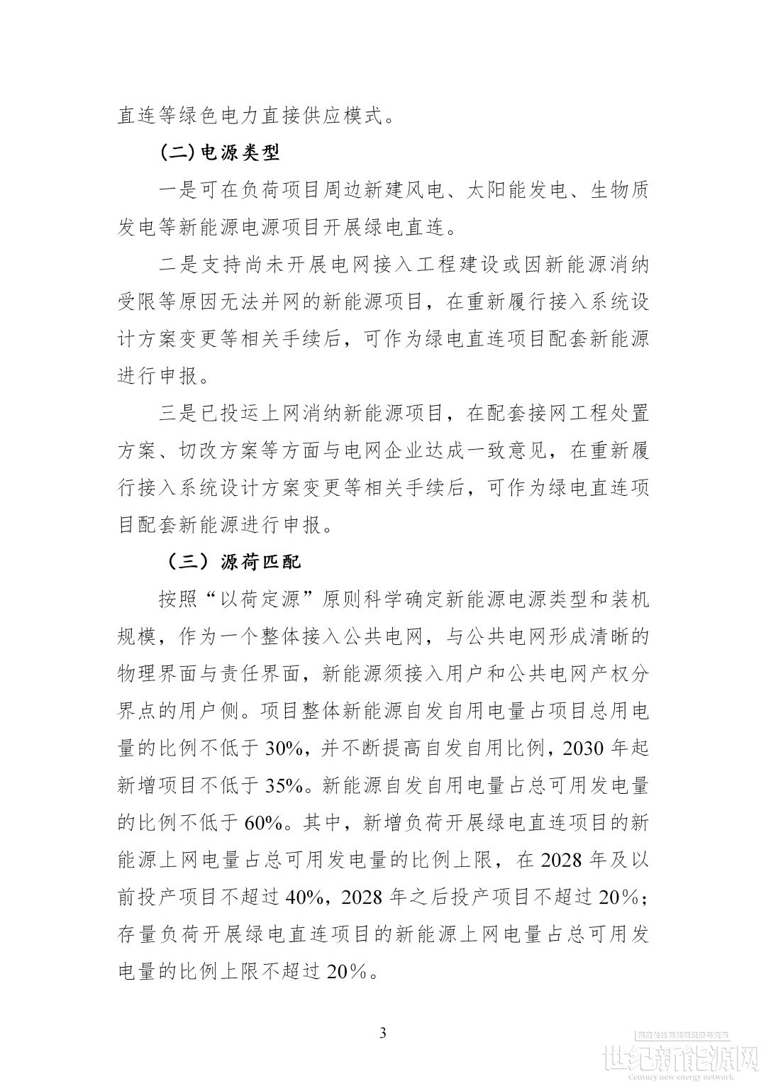 内容还指出,项目整体新能源自发自用电量占项目总用电量的比例不低于30%,并不断提高自发自用比例,2030年起新增项目不低于35%。新能源自发自用电量占总可用发电量的比例不低于60%。其中,新增负荷开展绿电直连项目的新能源上网电量占总可用发电量的比例上限,在2028年及以前投产项目不超过40%,2028年之后投产项目不超过20%;存量负荷开展绿电直连项目的新能源上网电量占总可用发电量的比例上限不超过20%。