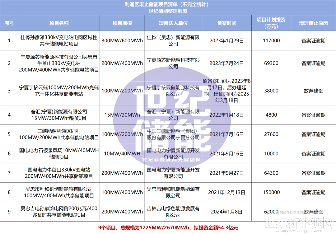 2月4日,宁夏吴忠市利通区发展和改革局发布《关于废止一批储能项目的公告》,本次共涉及9个项目,总规模为1225MW/2670MWh,拟投资金额54.3亿元。