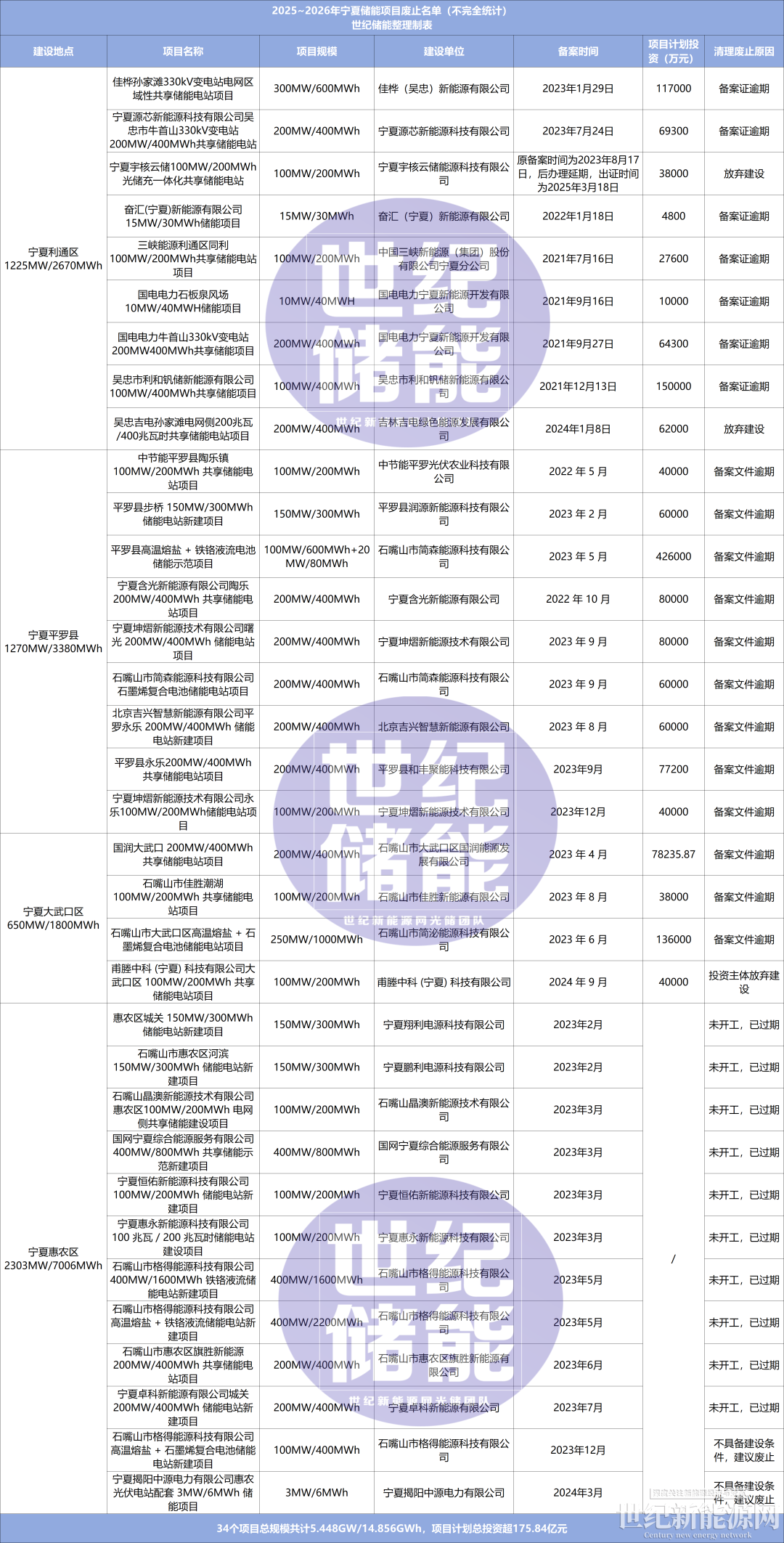 2026年1月20日,宁夏进一步出台储能项目管理新规,要求纳入年度建设清单的项目须在清单公布后6个月内实质性开工,12个月内建成并网;电化学储能项目电网接入意见有效期仅为1年,逾期未并网自动废止。