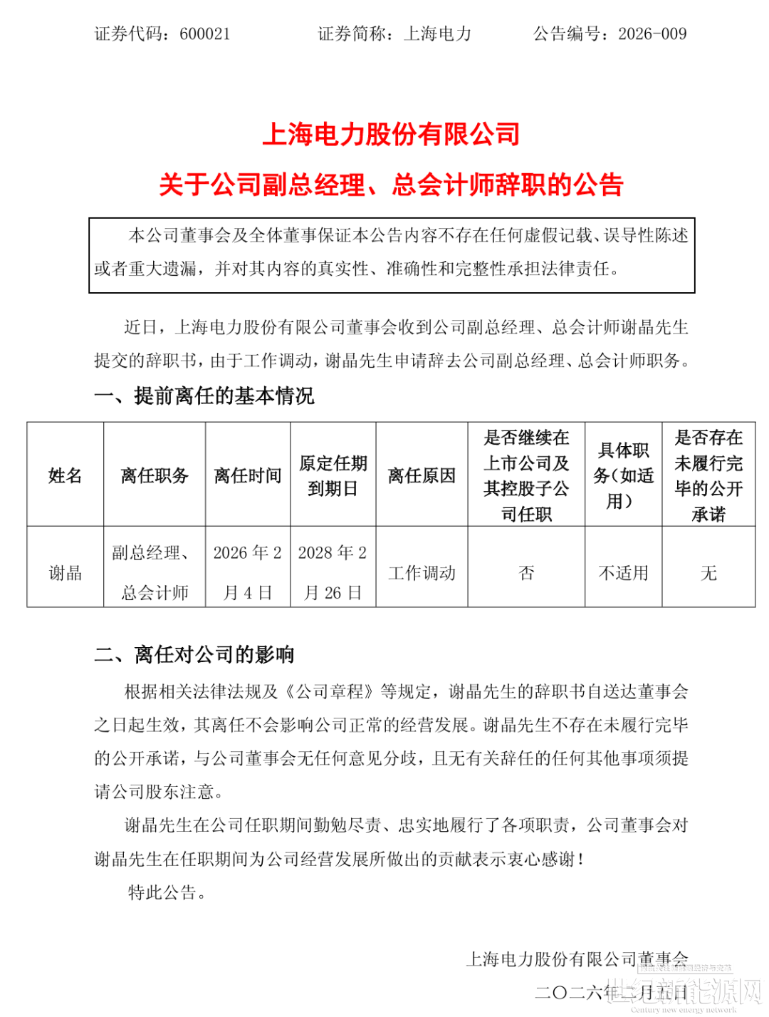 2月5日,上海电力发布公告,近日,上海电力股份有限公司董事会收到公司副总经理、总会计师谢晶先生的书面辞职报告,由于工作调动,谢晶先生申请辞去公司副总经理、总会计师职务。