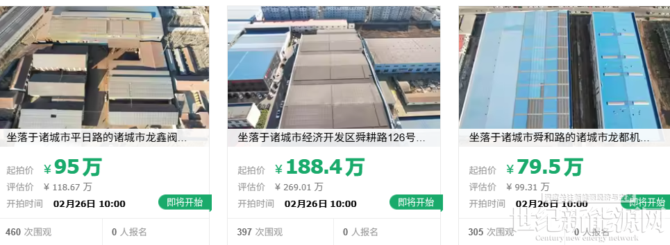 光伏电站三位于诸城市舜和路的诸城市龙都机械贸易有限公司、诸城飞越机械科技有限公司,评估价为99.31万元,起拍价79.5万元,保证金15万元,加价幅度为5000元。