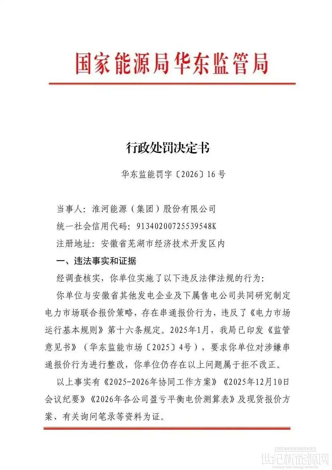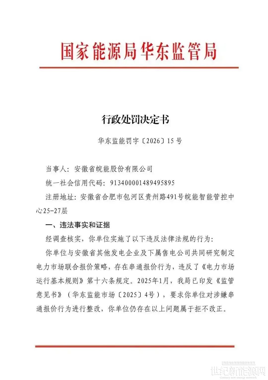 据行政处罚决定书显示,安徽省皖能股份有限公司、淮河能源(集团)股份有限公司、国能神皖能源有限责任公司3家单位共同研究制定电力市场联合报价策略,存在串通报价行为,违反了《电力市场运行基本规则》第十六条规定。2025年1月,华东能源监管局已印发《监管意见书》(华东监能市场〔2025〕4号),要求该3家单位对涉嫌串通报价行为进行整改,3家单位仍存在以上问题属于拒不改正。