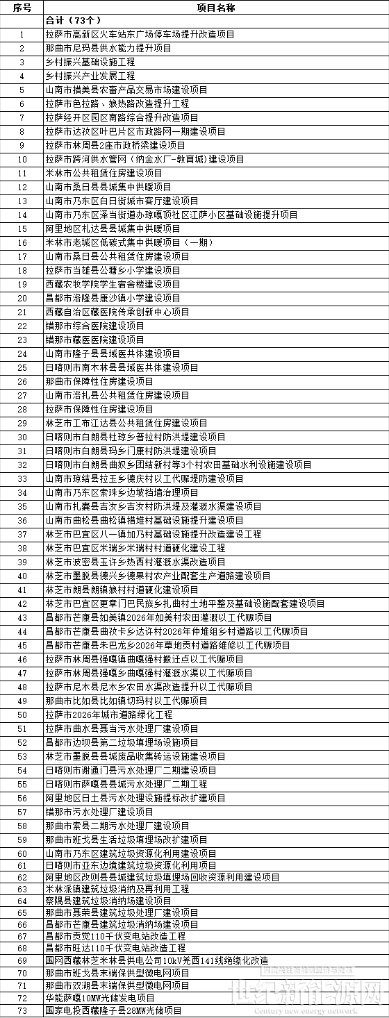 1月30日,西藏自治区发改委发布2026年第一批全区重点项目建设计划,共纳入73个项目。其中包括2个微电网项目和2个光储发电项目,分别为那曲市班戈县末端保供型微电网项目、那曲市双湖县末端保供型微电网项目、华能萨嘎10MW光储发电项目、国家电投西藏隆子县28MW光储项目。