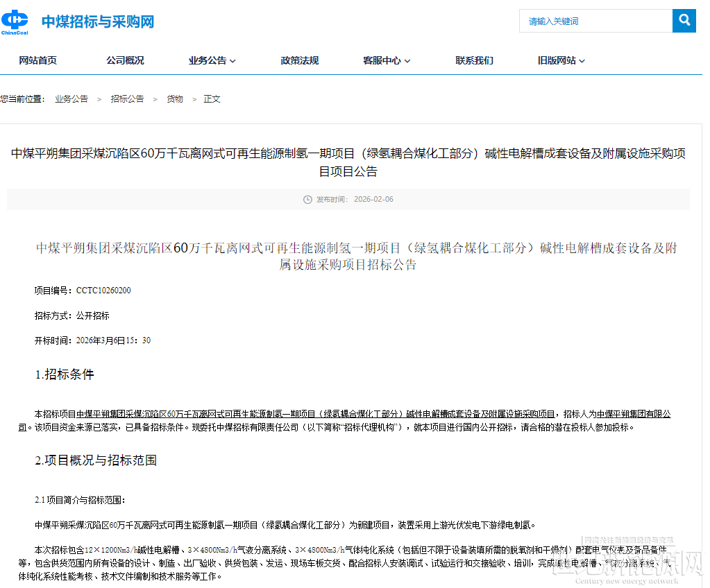 2月6日,中煤招标与采购网发布中煤平朔集团采煤沉陷区60万千瓦离网式可再生能源制氢一期项目(绿氢耦合煤化工部分)碱性电解槽成套设备及附属设施采购项目项目公告。