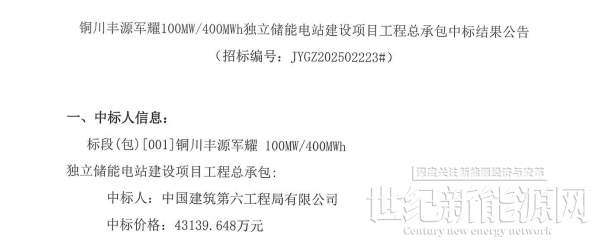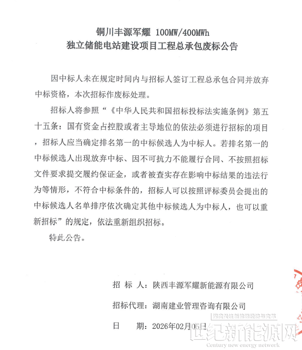 2月5日,铜川丰源军耀 100MW/400MWh 独立储能电站建设项目工程总承包废标公告发布。