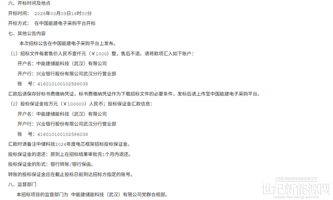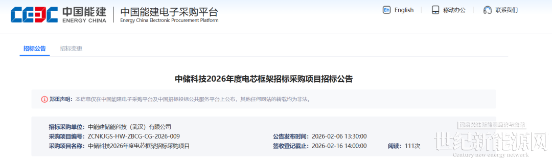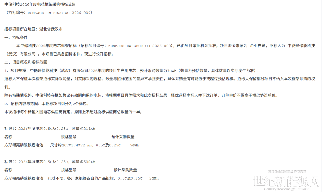 2月6日,中国能建旗下中储科技发布2026年度电芯框架招标公告。预计采购容量为7GWh,分为两个标包。