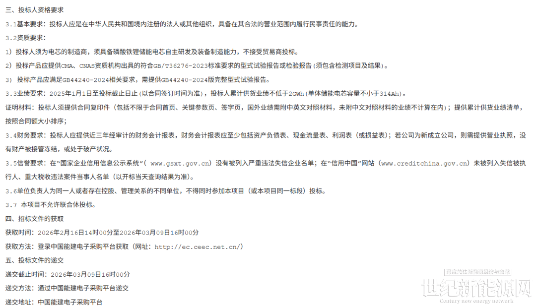 招标公告要求,投标人须为电芯的制造商,须具备磷酸铁锂储能电芯自主研发及装备制造能力,不接受贸易商投标。2025年1月1日至投标截止日止(以合同签订时间为准),投标人累计供货业绩不低于2GWh(单体储能电芯容量不小于314Ah)。