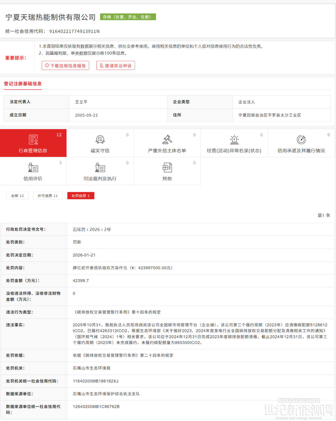 日前,信用中国(宁夏)官方网站公示了一条因碳排放配额未足额清缴被处罚的信息,处罚金额达4.2399亿元。