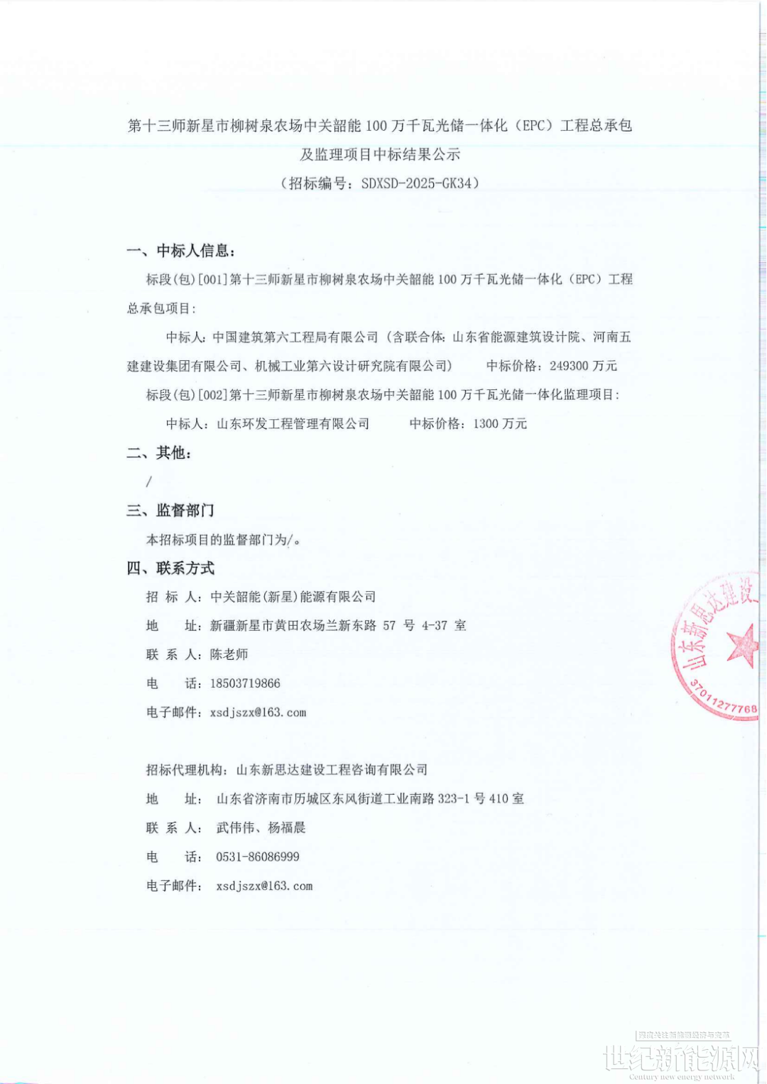 2月7日,新疆第十三师新星市柳树泉农场中关韶能100万千瓦光储一体化项目公布了工程总承包及监理的中标结果,其中(EPC)工程总承包部分由中国建筑第六工程局有限公司联合多家单位成功中标,投标报价为24.93亿元。