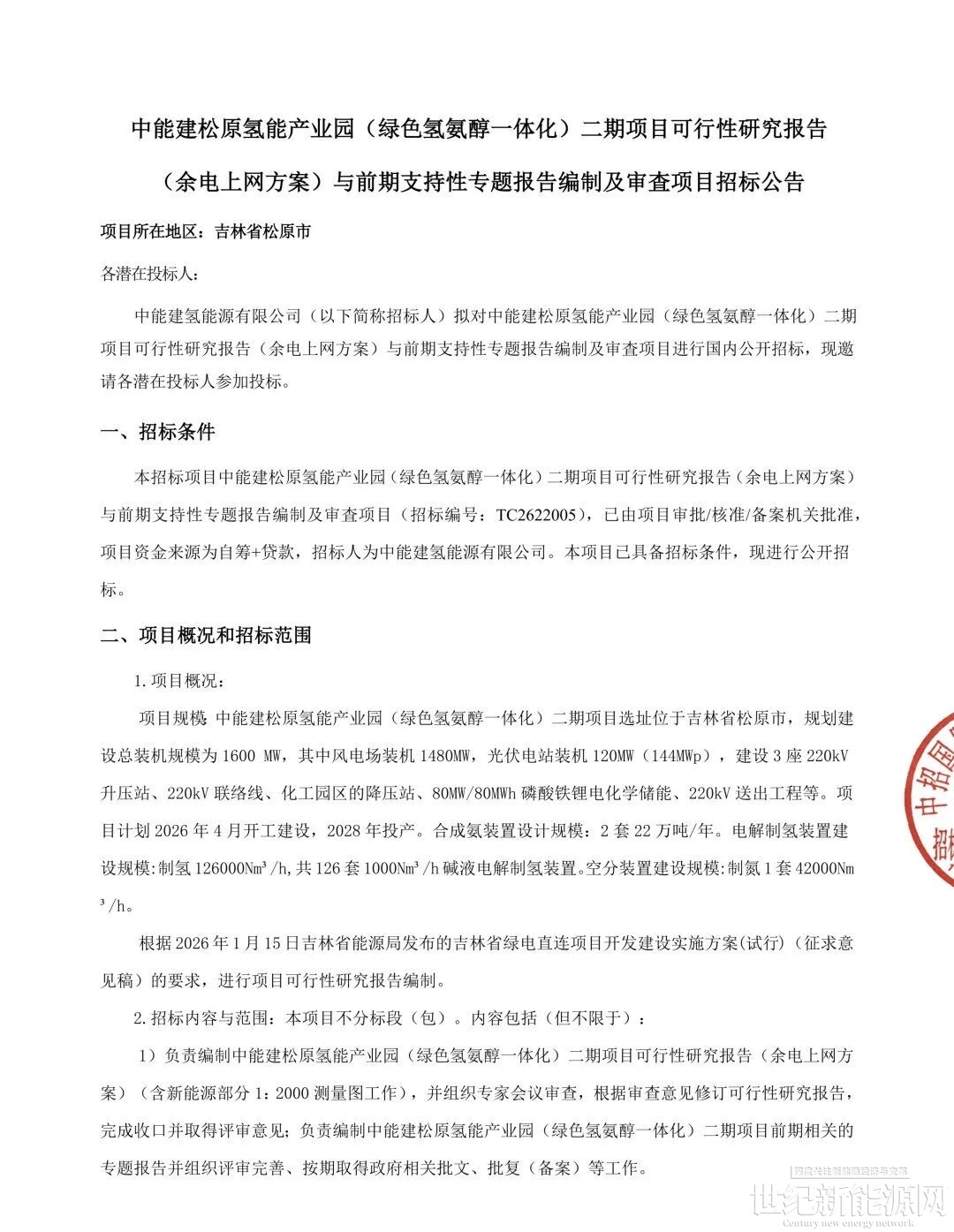 2月7日,中国招标投标公共服务平台发布中能建松原氢能产业园(绿色氢氨醇一体化)二期项目可行性研究报告(余电上网版)与前期支持报告编制及审査招标公告。