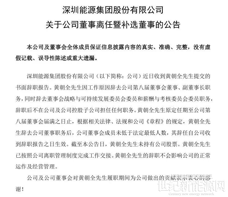 2月6日,深圳能源发布公告称,近日收到黄朝全先生提交的书面辞职报告。黄朝全先生因工作原因辞去公司第八届董事会董事、副董事长职务,同时辞去董事会战略与可持续发展委员会委员和薪酬与考核委员会委员职务,辞职后不在公司及公司控股子公司担任任何职务。