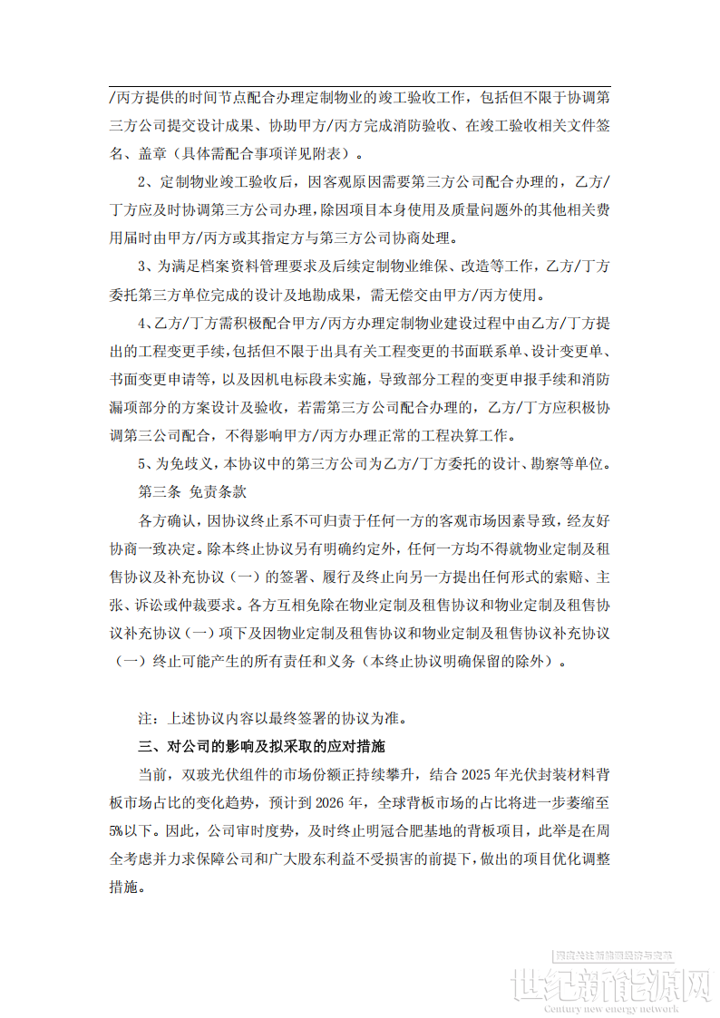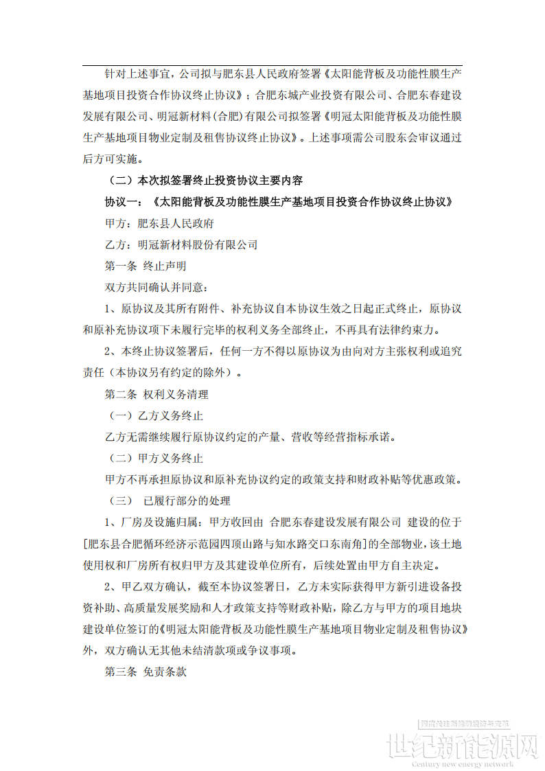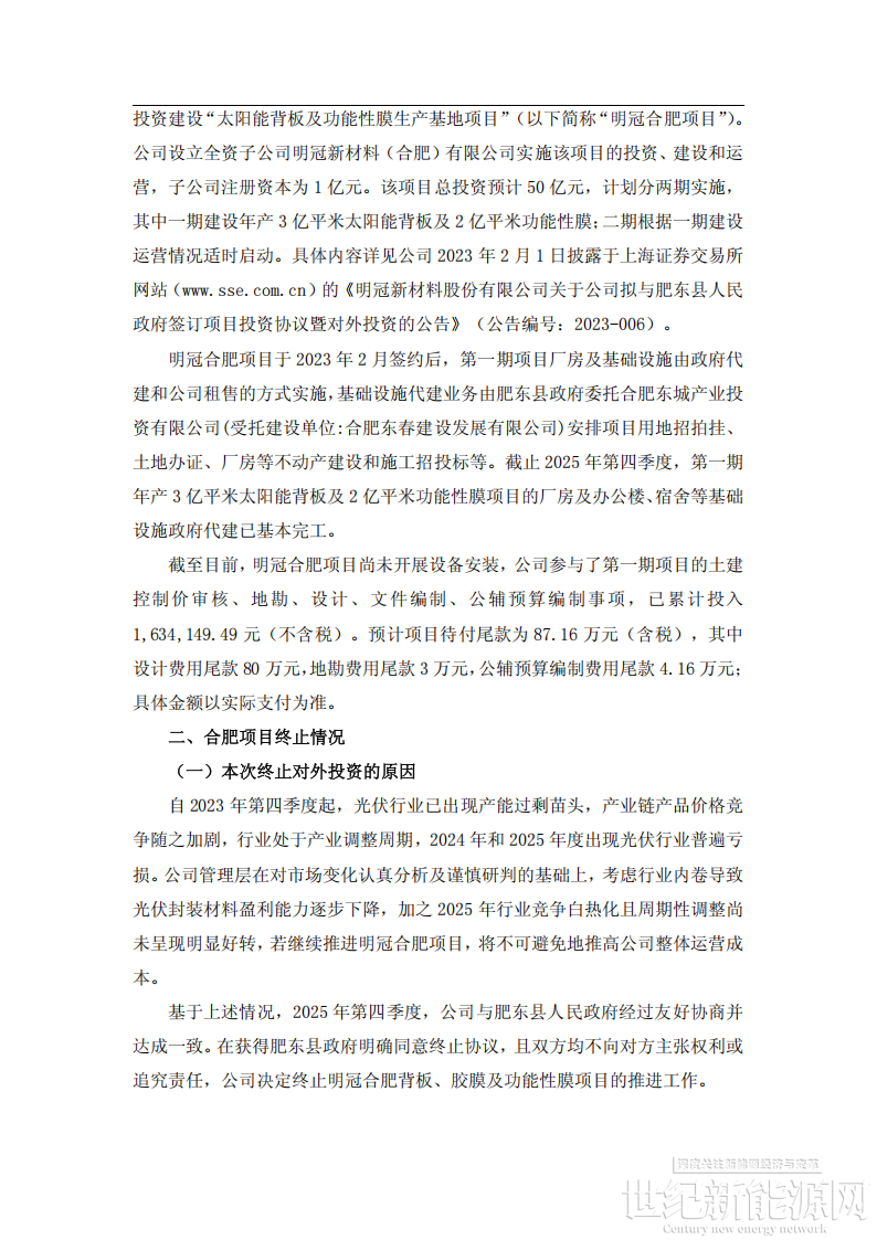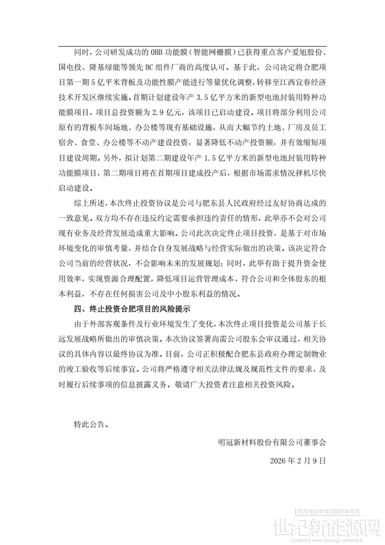 基于上述情况,2025年第四季度,公司与肥东县人民政府经过友好协商并达成一致。在获得肥东县政府明确同意终止协议,且双方均不向对方主张权利或追究责任,公司决定终止明冠合肥背板、胶膜及功能性膜项目的推进工作。