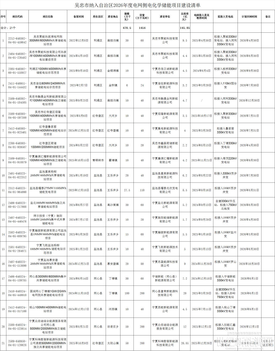 2月9日,吴忠市发展和改革委员会发布关于对吴忠市纳入自治区2026年度电网侧电化学储能项目建设清单的公示。此次清单包含21个储能项目,总规模为4.785GW/14.54GWh,项目总投资为145.9亿元。
