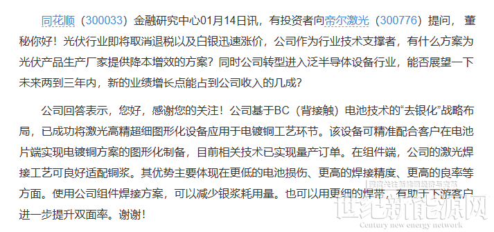 除了帝尔激光,海目星深耕激光和自动化领域多年,在光伏领域已成功研制出BC大光斑激光开膜设备,目前该设备已在部分客户端进入批量验证阶段,有望在未来实现大规模应用。英诺激光作为光伏激光设备领域的潜力新星,拥有超快固体激光器自制的独特优势,在BC电池提效设备业务方面进展顺利,已完成量产验证。