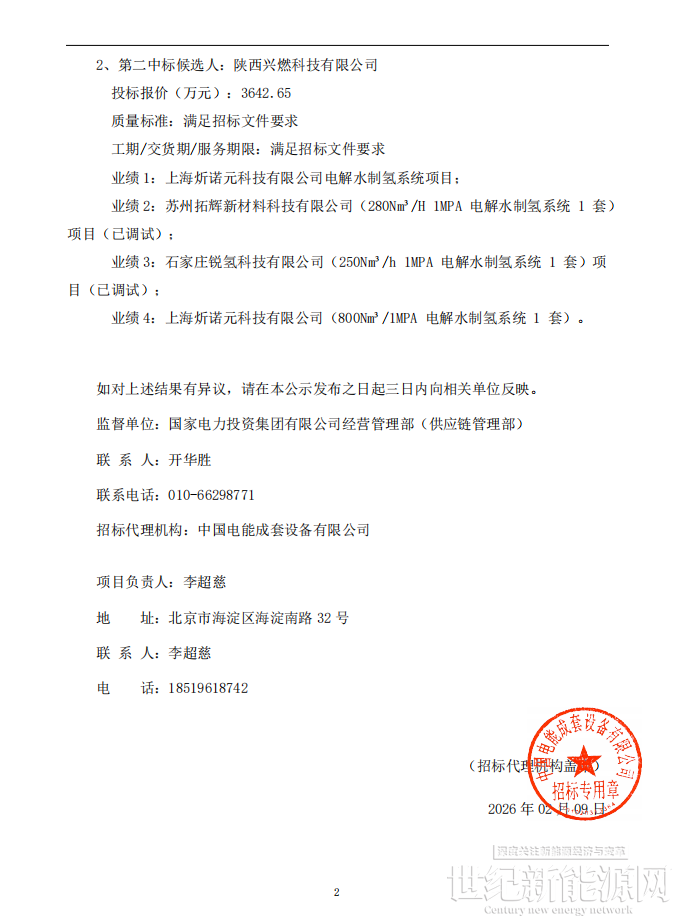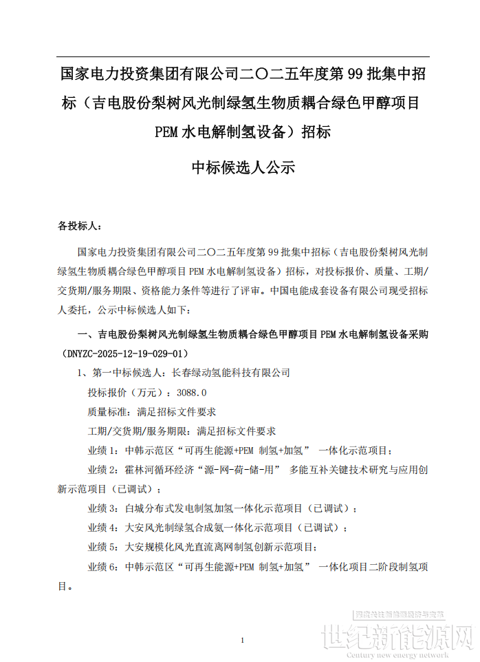 2月9日,国家电投电子商务平台发布国家电力投资集团有限公司二〇二五年度第 99 批集中招标(吉电股份梨树风光制绿氢生物质耦合绿色甲醇项目PEM 水电解制氢设备)招标中标候选人公示。