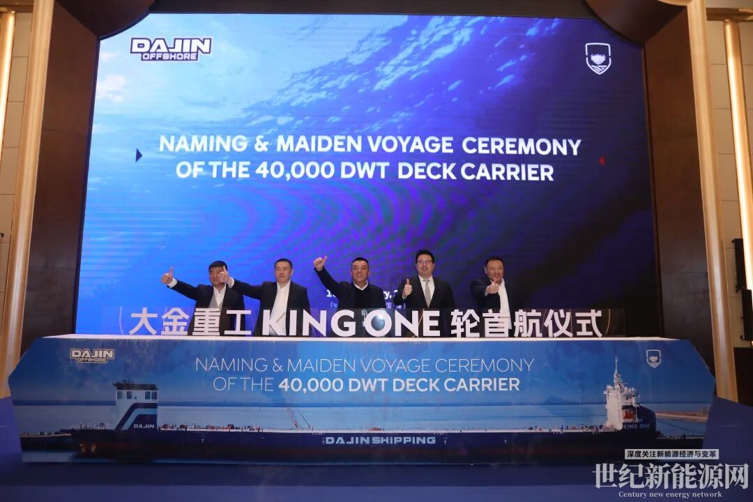 2026年2月10日,大金重工首制4万吨甲板运输船KING ONE轮命名暨首航仪式在大金蓬莱海工基地隆重举行。仪式现场,嘉宾云集、礼炮齐鸣,在各方见证下,KING ONE轮正式命名并鸣笛启航,开启全球运营征程。