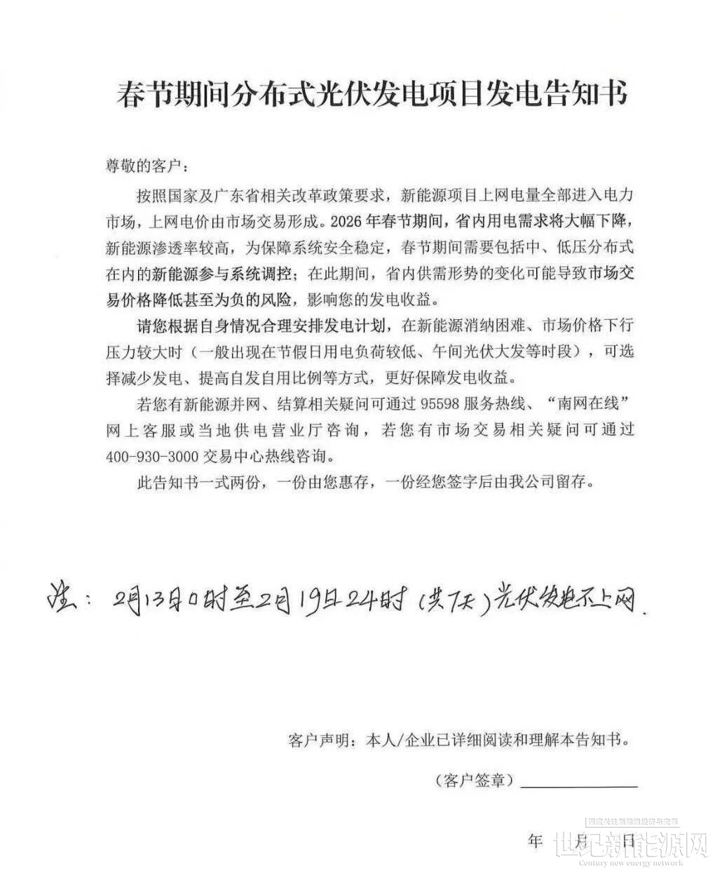 近日,一份南方电网广东区域向分布式光伏发电项目用户发布的《春节期间分布式光伏发电项目发电告知书》在光伏人的朋友圈流传。该告知书明确,2026年春节期间,省内中、低压分布式需要参与系统调控,还另注明2月13日0时至2月19日24时这七天之内,光伏发电不上网。