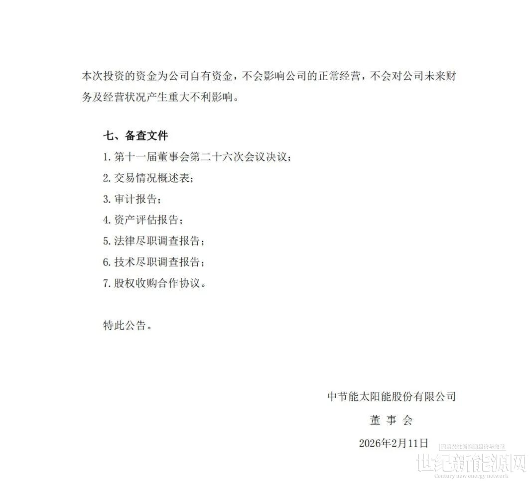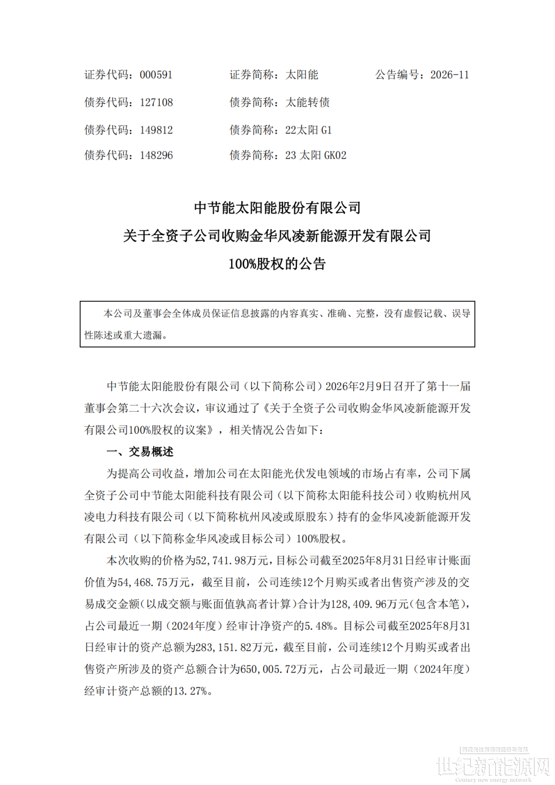 2月11日,中节能旗下上市企业太阳能发布《关于全资子公司收购金华风凌新能源开发有限公司100%股权的公告》。