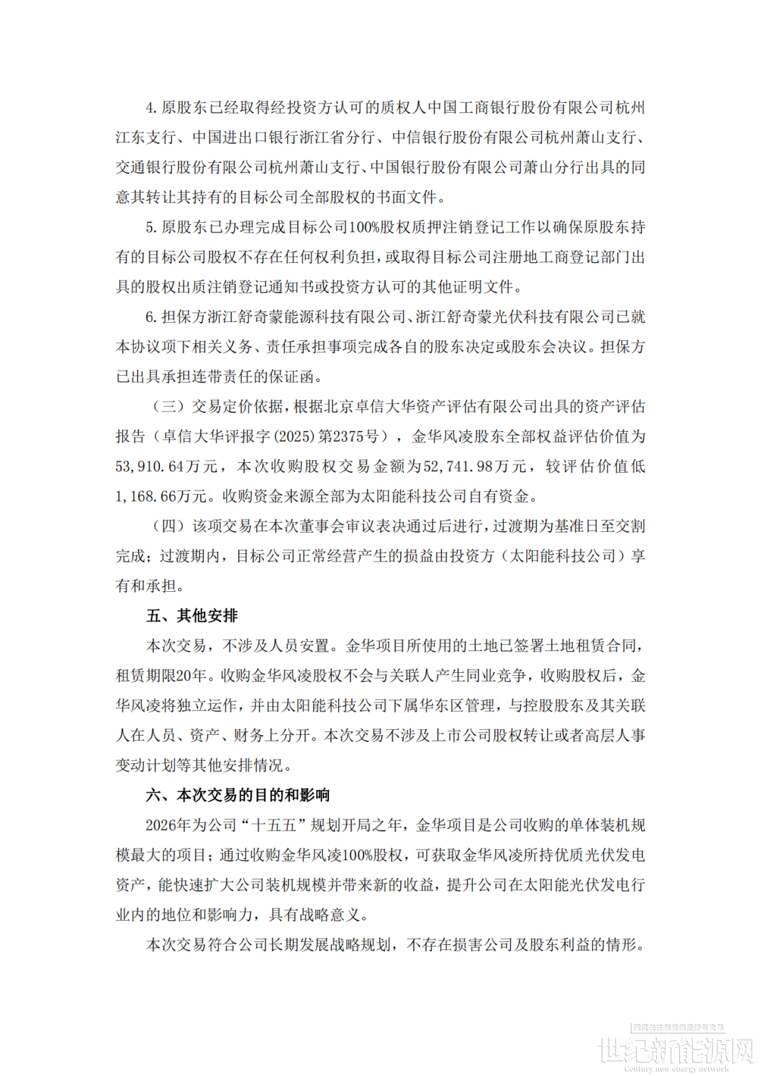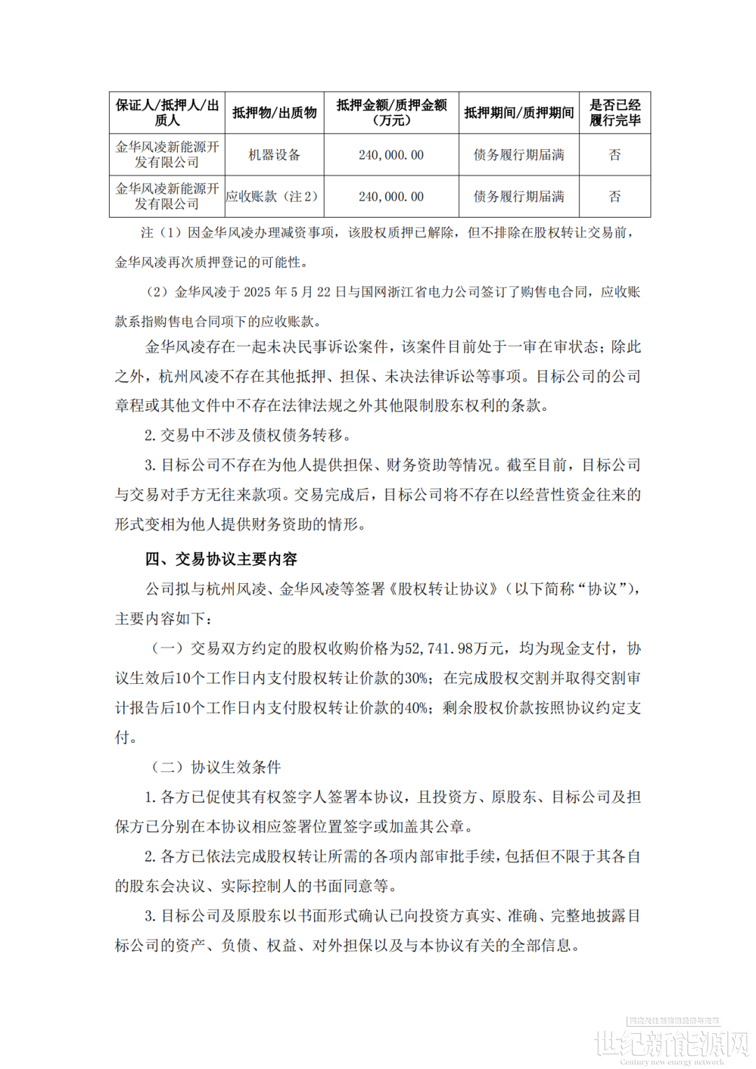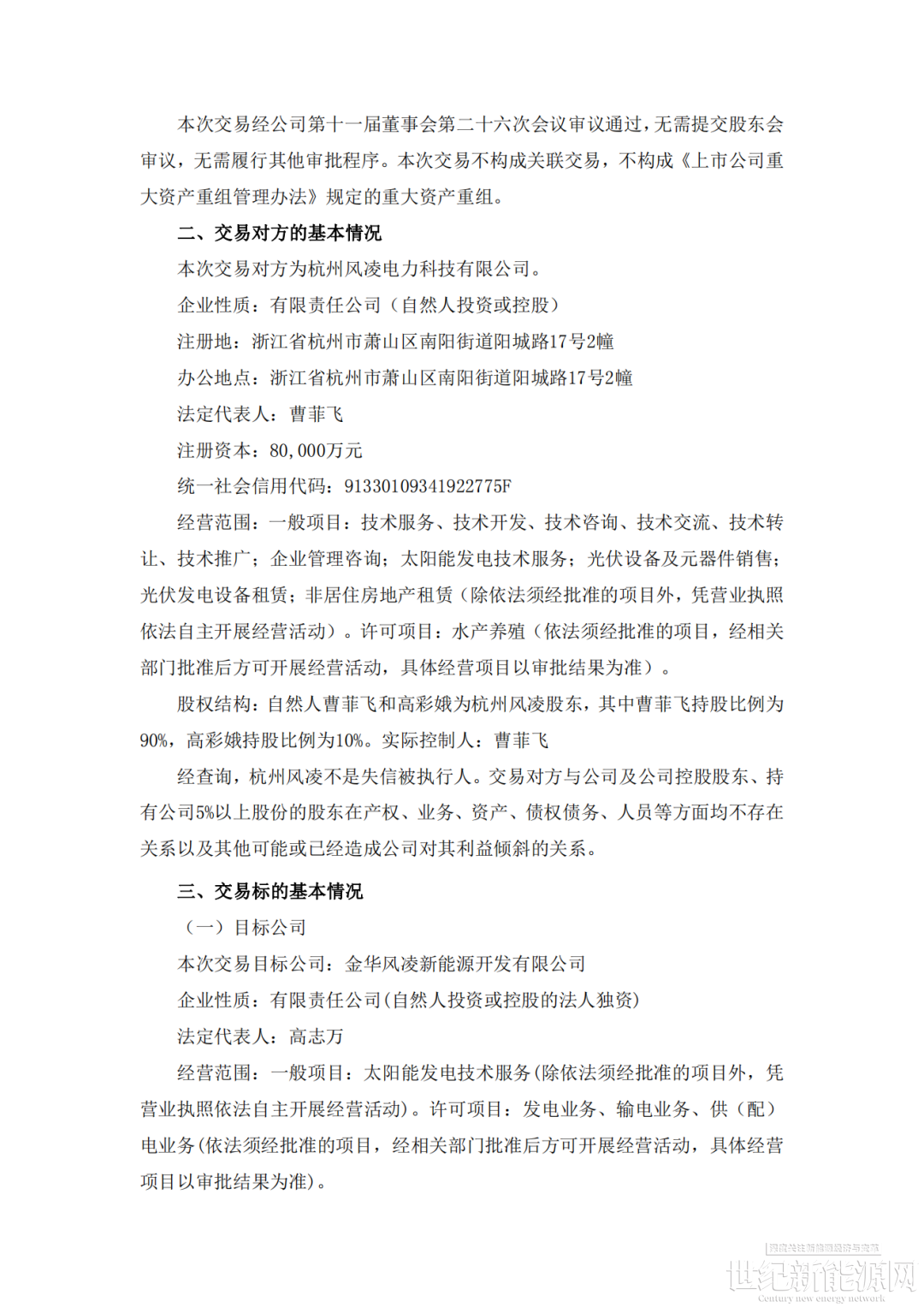 根据公告,中节能太阳能科技有限公司拟收购杭州风凌电力科技有限公司持有的金华风凌新能源开发有限公司100%股权。