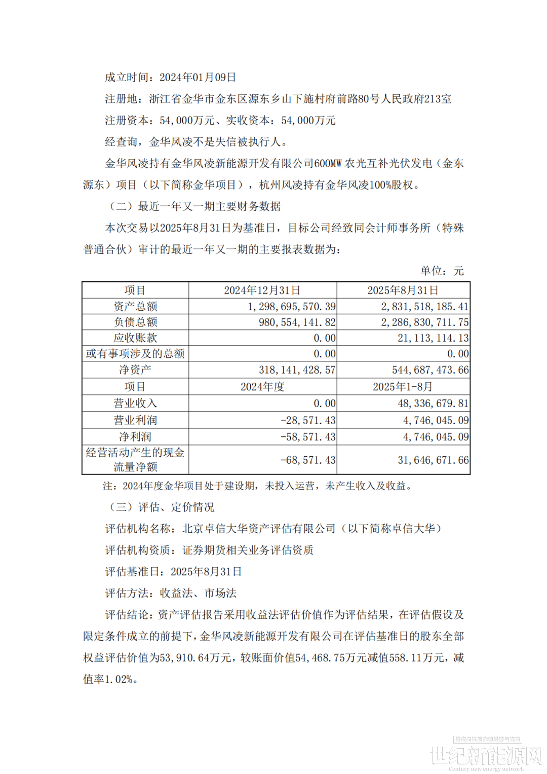 公告信息显示,金华风凌持有金华风凌新能源开发有限公司持有600MW农光互补光伏发电项目,备案建设规模为交流侧600兆瓦,实际建设规模为直流侧710兆瓦、交流侧600兆瓦,于2025年5月25日并网;