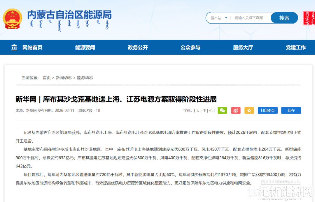 2月11日,内蒙古能源局官微发布信息显示,库布齐送电上海、库布齐送电江苏沙戈荒基地电源方案获得国家能源局批复,标志着基地推进工作取得阶段性进展。预计2026年底前,配套支撑性煤电将正式开工建设。