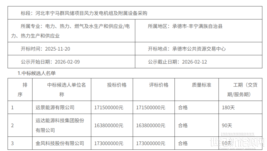 2月9日,河北丰宁马群风储项目风力发电机组及附属设备采购项目、防城南山风电场二期项目风力发电机组(含塔筒及法兰)及附属设备采购项目中标候选人公示。