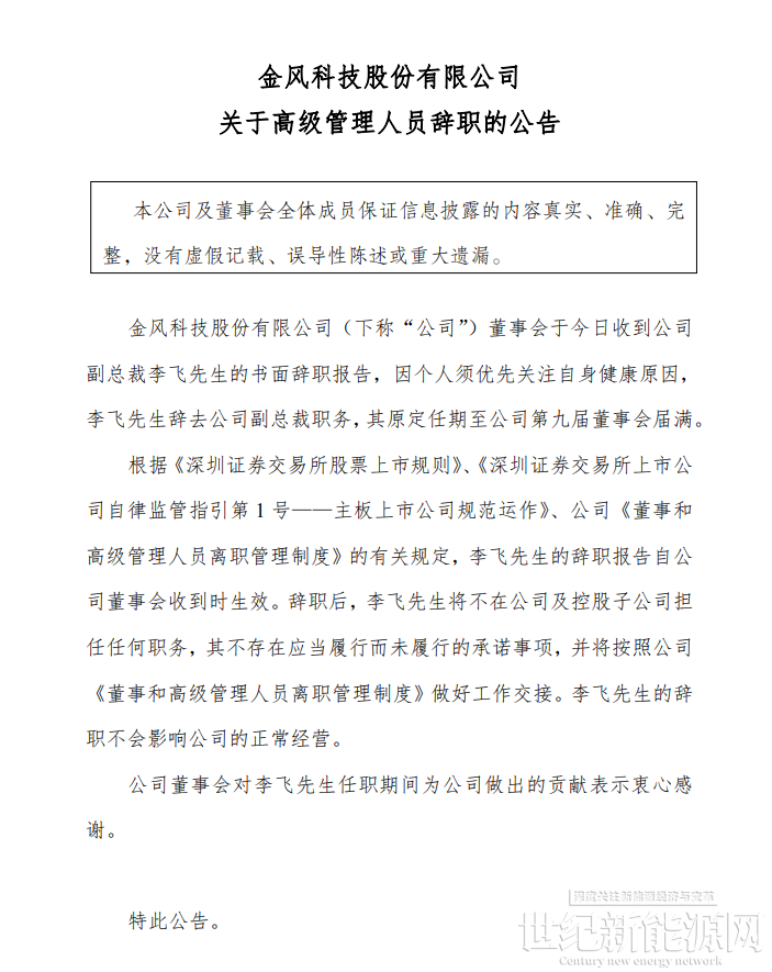 2月11日,风电龙头金风科技发布公告,公司副总裁李飞因个人健康原因辞去副总裁职务,其原定任期至公司第九届董事会届满,辞职报告自董事会收到时即刻生效。辞职后,李飞将不再在公司及控股子公司担任任何职务,且无未履行的承诺事项,后续将按制度完成工作交接。