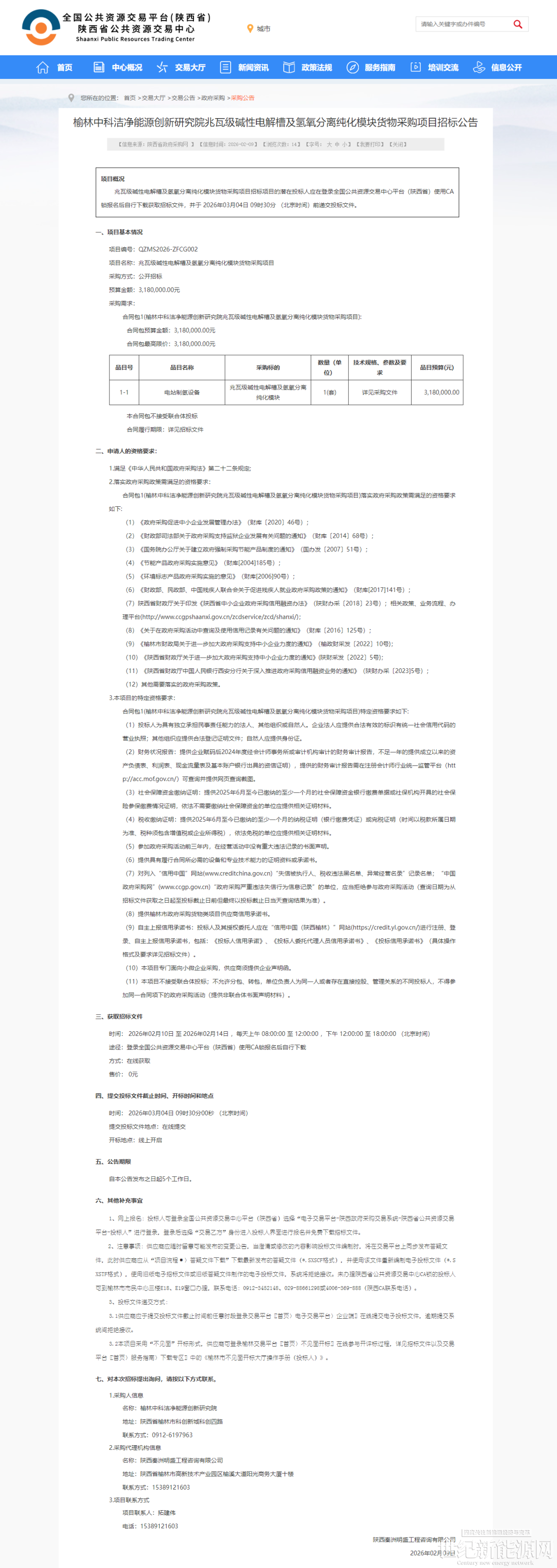2月9日,陕西省公共资源交易中心发布榆林中科洁净能源创新研究院兆瓦级碱性电解槽及氢氧分离纯化模块货物采购项目招标公告。