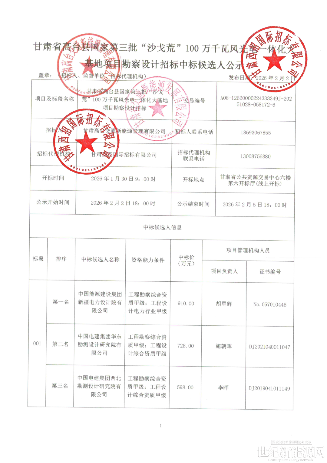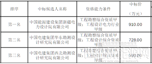 根据公示,中国能源建设集团新疆电力设计院有限公司为中标候选人第一名。